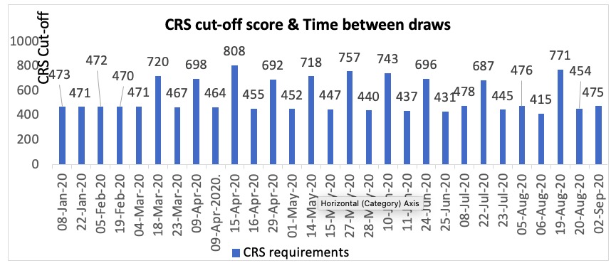 The time between draws is an essential factor which can influence the CRS cut-off point. Larger intervals between draws mean more candidates have time to enter a profile in the Express Entry pool. (check the graph below for CRS cut off score and time between each draws).