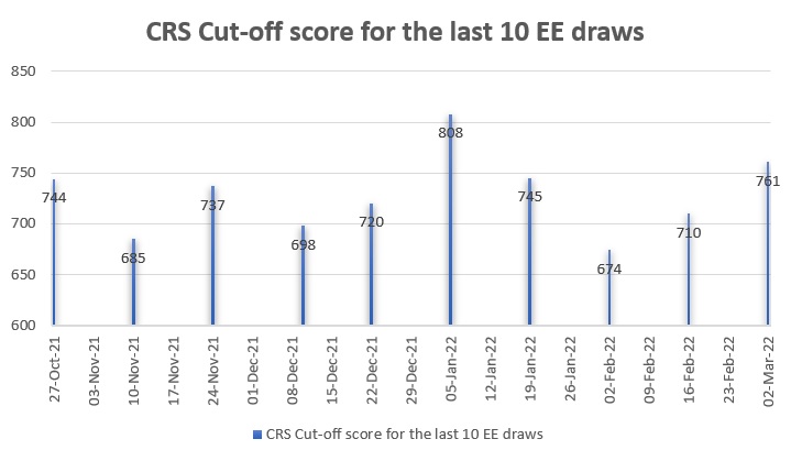 In the last round total 1082 which was a record draw Provincial Nominee Programs (PNP) candidates were invited. The following chart shows the CRS Cut-off scores for the last 10 EE draws.