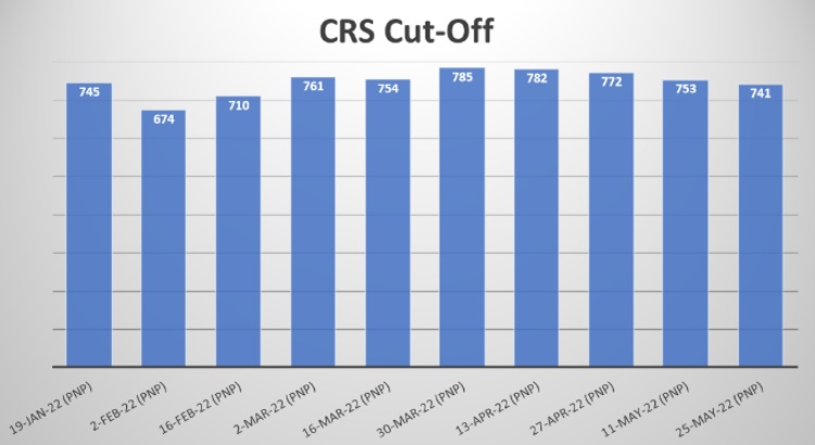 The following chart shows the CRS Cut-off scores for the last 10 EE draws: