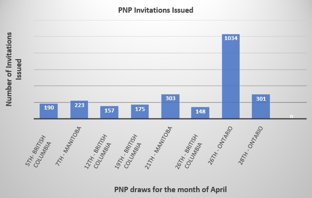 British Columbia held a total of 4 draws in the month of April, inviting 670 candidates to apply for provincial nomination through Express Entry BC and skills immigration streams.