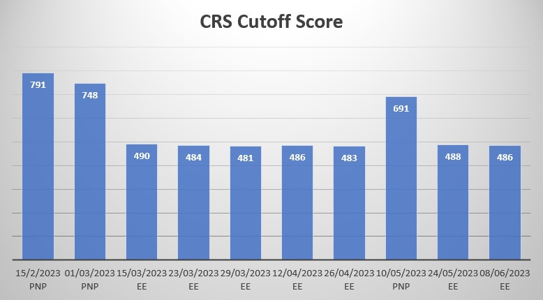 The below chart shows the CRS Cut-off scores for the last 10 EE draws: