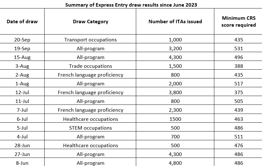 On the very next day, i.e., on September 20, Immigration, Refugees, and Citizenship Canada (IRCC) held its second Express Entry draw of the week. A total of 1,000 candidates were invited to apply for permanent residence in this draw, and they were employed in transport-related occupational categories. It was a categories-specific draw. The minimum Comprehensive Ranking System (CRS) required to receive an Invitation to Apply (ITA) in this draw was 435.