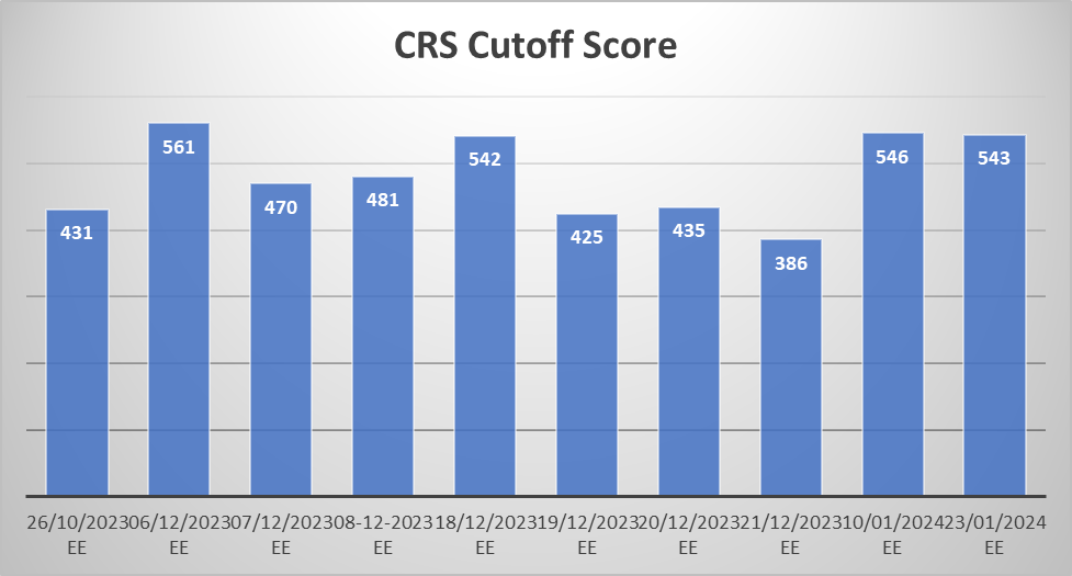 A chart depicting the CRS cut-off scores for the last 10 EE draws